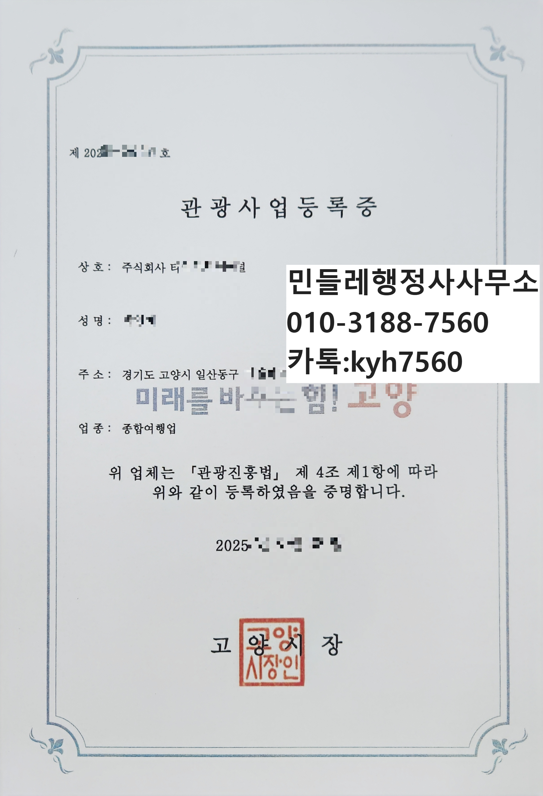 행정 업무는 단순히 지식을 파는 일이 아닙니다. 의뢰인의 소중한 사업과 그 뒤에 있는 가족의 생계를 함께 책임지는 사명감이 필요합니다. 고양시청에서 성공적으로 종합여행업 등록을 마친 이번 사례도 대표님과의 깊은 신뢰가 있었기에 가능했습니다. "여행업을 가장 잘 아는 행정사에게 다시 맡기고 싶다"는 그 한마디가 저희의 자부심입니다.